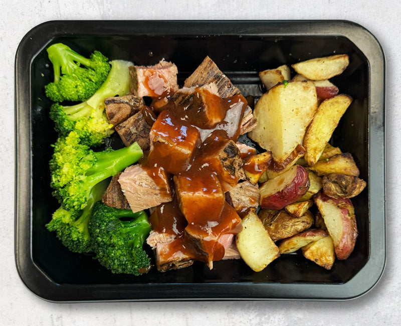 Steak (Flank Steak, Vegetable Oil, Potato Flour), Baked Potato, Broccoli, Tomato Puree , Apple Cider Vinegar, Agave Syrup, Chile Powder, Onion Powder, Garlic Powder, Paprika, Liquid Smoke - Mesquite, Kosher Salt