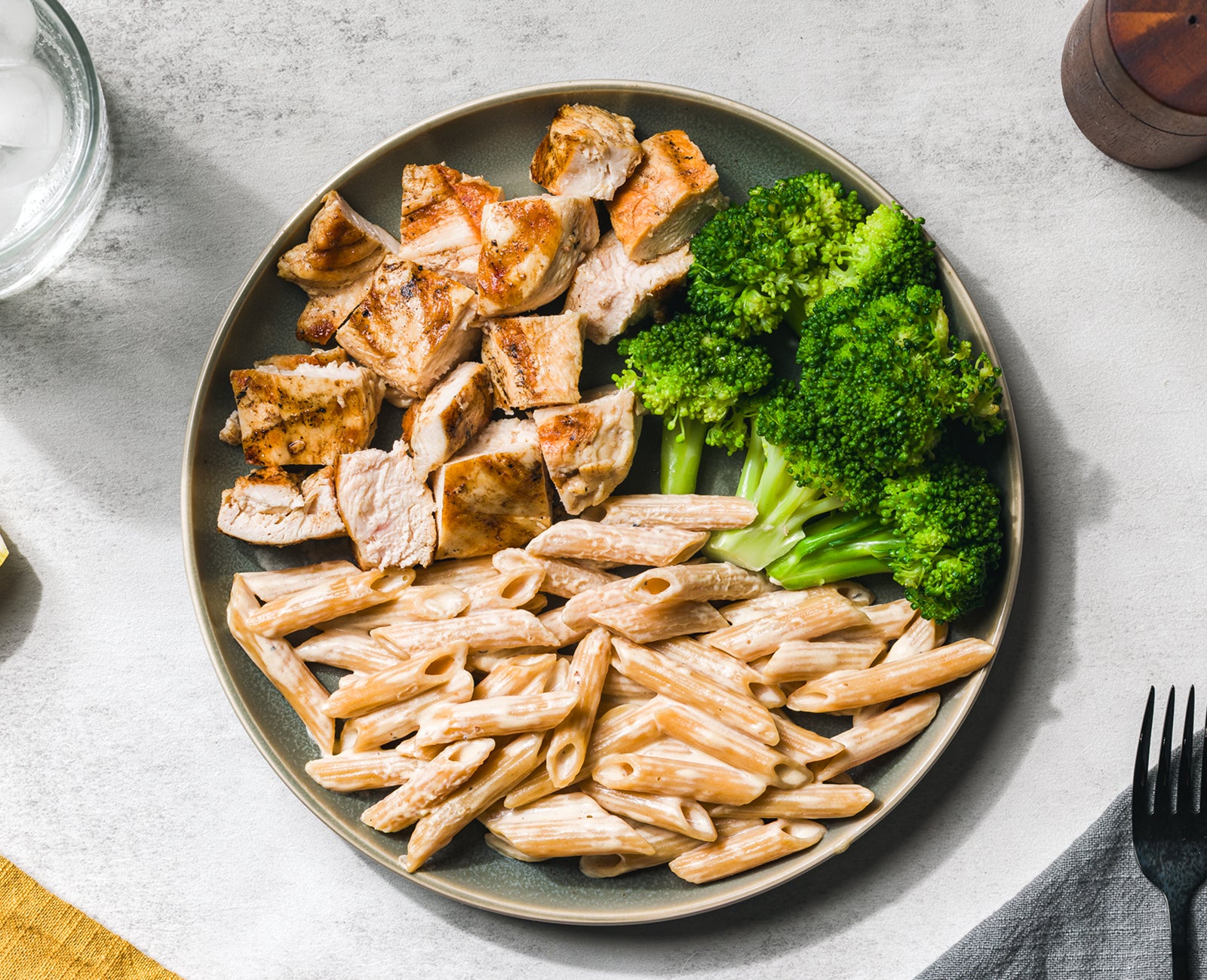 Ingredients: Chicken breast (potato flour, vegetable oil), broccoli, heavy cream, skim milk, whole milk, Pecorino Romano cheese, modified food starch palm oil blend, salt, disodium phosphate, citric acid, xanthan gum, trisodium citrate, powdered cellulose, butter, parsley, black pepper, whole wheat penne.