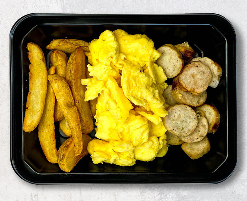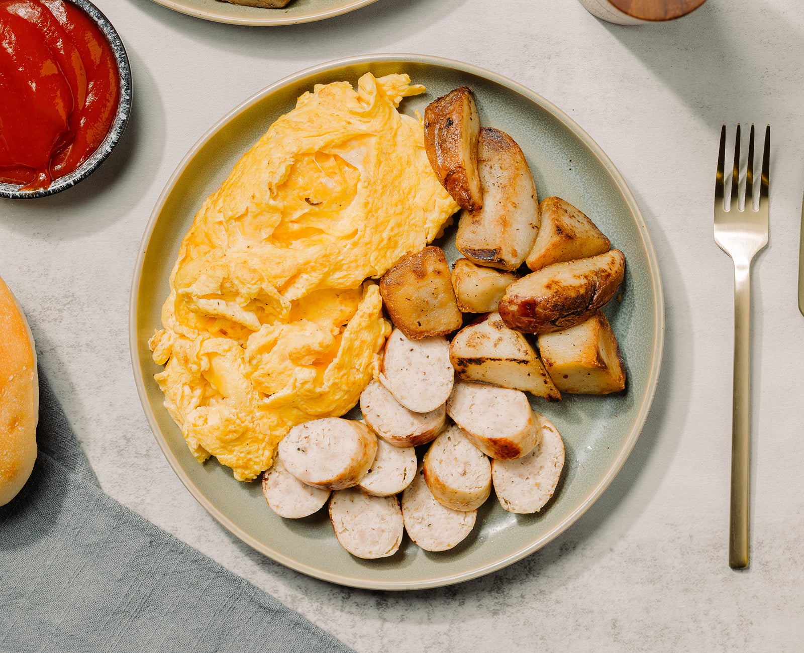 Scrambled eggs served with chicken sausage and baked potato wedges
