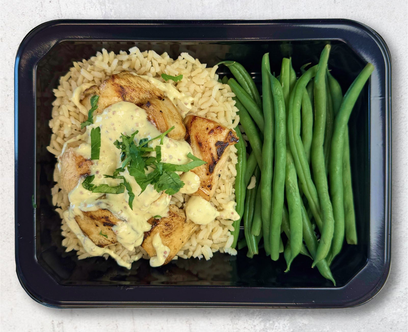Ingredients: Chicken Breast (Potato Flour, Vegetable Oil), French Style Green Beans (Low Sodium), Brown Rice, Heavy Cream, Skim Milk, Chicken Stock, Mustard (Water, Vinegar, Mustard Seed, Salt, White Wine, Fruit Pectin, Citric Acid, Tartaric Acid, Sugar, Spice), Whole Grain Mustard (Water, Mustard Seeds, Distilled Vinegar, Salt, White Wine, Sugar, Lactic Acid, Natural Flavor), Honey