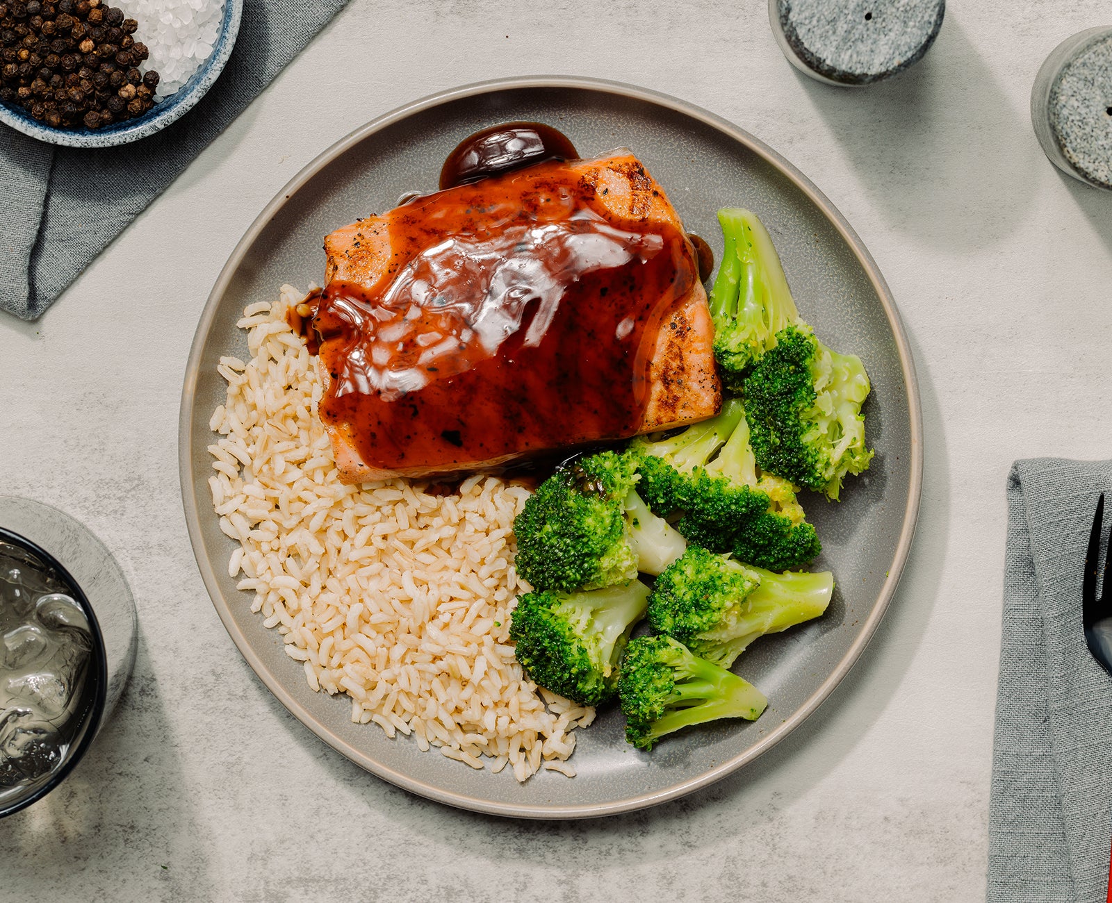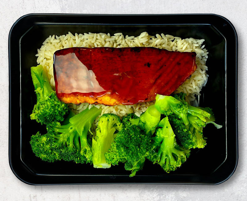 Roasted salmon filet topped with tangy teriyaki sauce served with white rice and broccoli